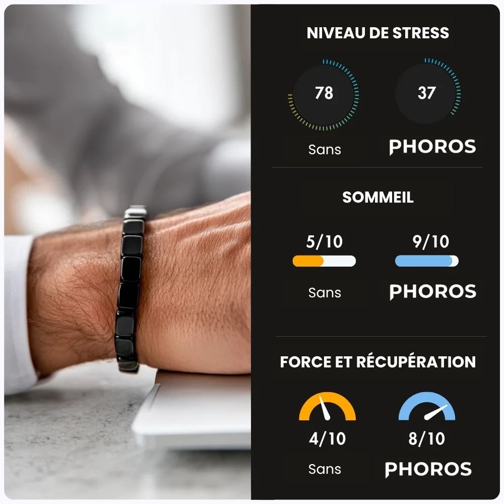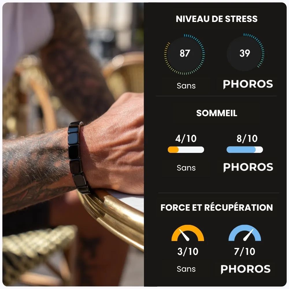 Libérez votre force naturelle avec Phoros, le premier bracelet masculin conçu en hématite pure, pensé pour agir en synergie avec le champ énergétique de votre corps.